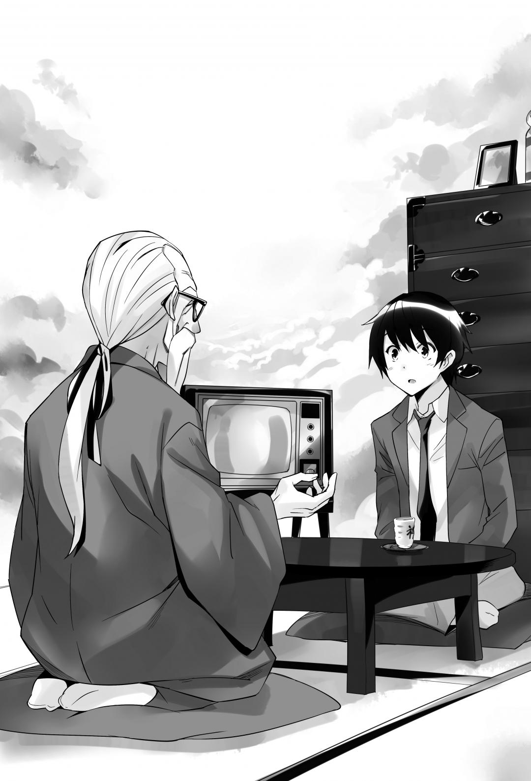 าชรา้ัลงสุด โมีะเหมอกเปล่งประกายแผ่้าอยู่เบื้องหลัง มองไม่เห็นปาาเลย่าพรม้เมฆี้้ายาวไปถึงที่ไหน แ่ที่ตนำันั่งอยู่ืบนเื่ทาทาิ เป็น้ขนาดี่เื่ครึ่งเีๆ ที่ลอยอยู่บนเมฆ (ถึงะบอก่า้แ่็ไม่มีกำแพงืเพดาน) ทั้งโ๊ะเตี้ยัตู้า โทัศน์ุ่ย้อนุัโั์สีดำ มีแ่เครื่องเรือนที่ให้ความรู้สึกเก่าแก่เีาอยู่