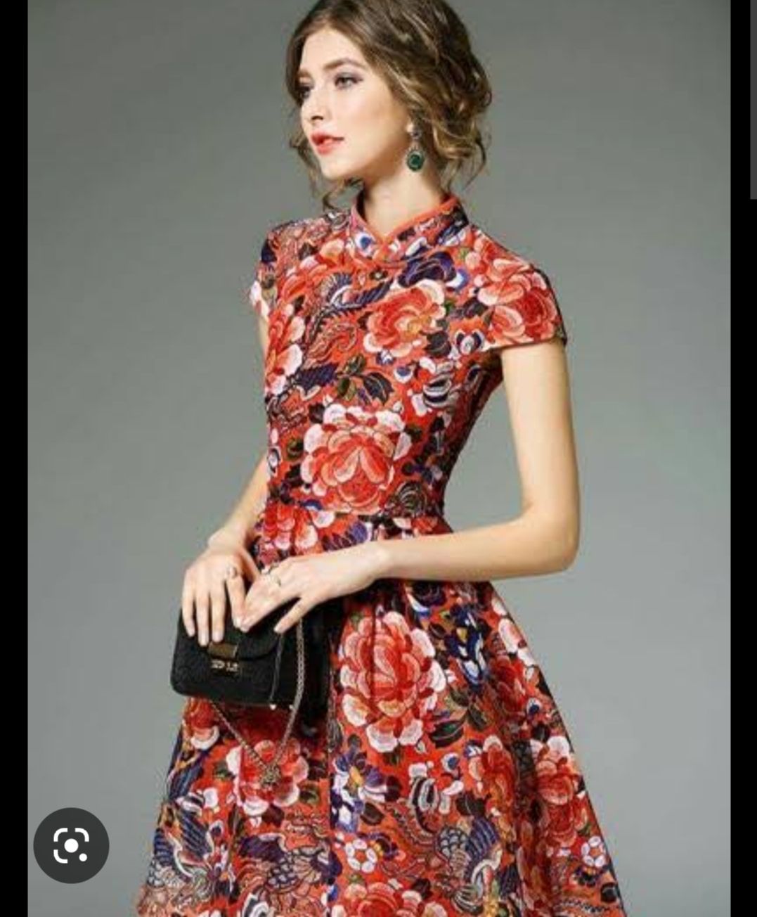 ี่าัาใชุดี่เพ้าแบบโเิ์ แบบแขนั้ลายไ้สีโแดง แะชายกระโปรงาเหัวเข่าไปิ่ ูสวยแะแเซ็กซี่เป็