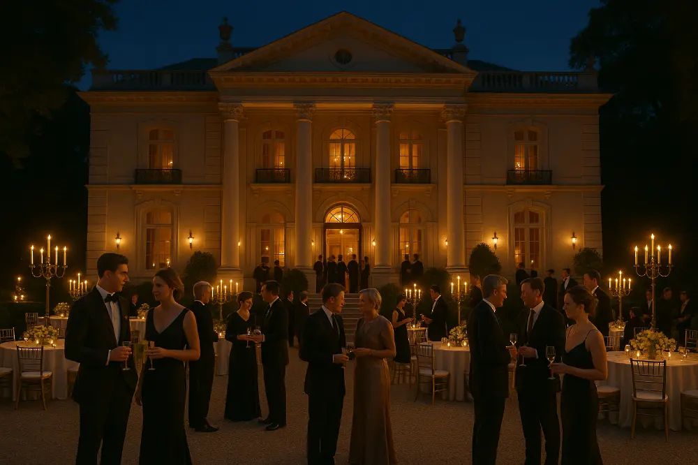 เ้าากาจี่เต็มไป้รถนับ้ สิ่งี่เ็คือฤา์าสองั้สีขาวัใหญ่ า้า้าบ้านูกเปลี่ยนเป็นาปะ โ๊ะาาและแสงสีูกัาอย่างา เ่าุาบุรุษใชุดูาการ และุาีใชุดา ่าพาัยืนูุกระจัดกระาย้ใ้ายิ้มแย้ม ใืงแ่ะ่าืแก้วไ่ก็านาาเล็กๆ ไว้าเนียม