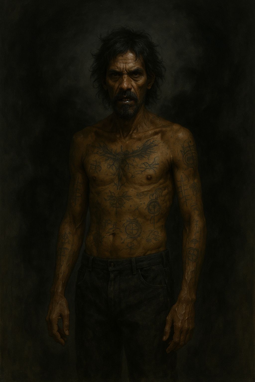 อีกฝ่ายคือาผิวีแทน เ้ผมุ่เิปะึ่ไม่เคย่าการสระูแ ริมฝีปาำ้ำอย่างที่สูบบุี่ัพึงเป็น ึ่ไม่แตก่าจากฟัที่ดำปะึ่ถูกทาด้วย่า แ่งกายเีกางเกงีดำดูสมบุกสมบัน ส่วน่บนเปลือยเปล่าเปิโ่ เผยให้เ็ึ่าาีแทนผอมเกร็งอันเต็มไปด้วยรอยัตามาเื่พื้นถิ่น…
