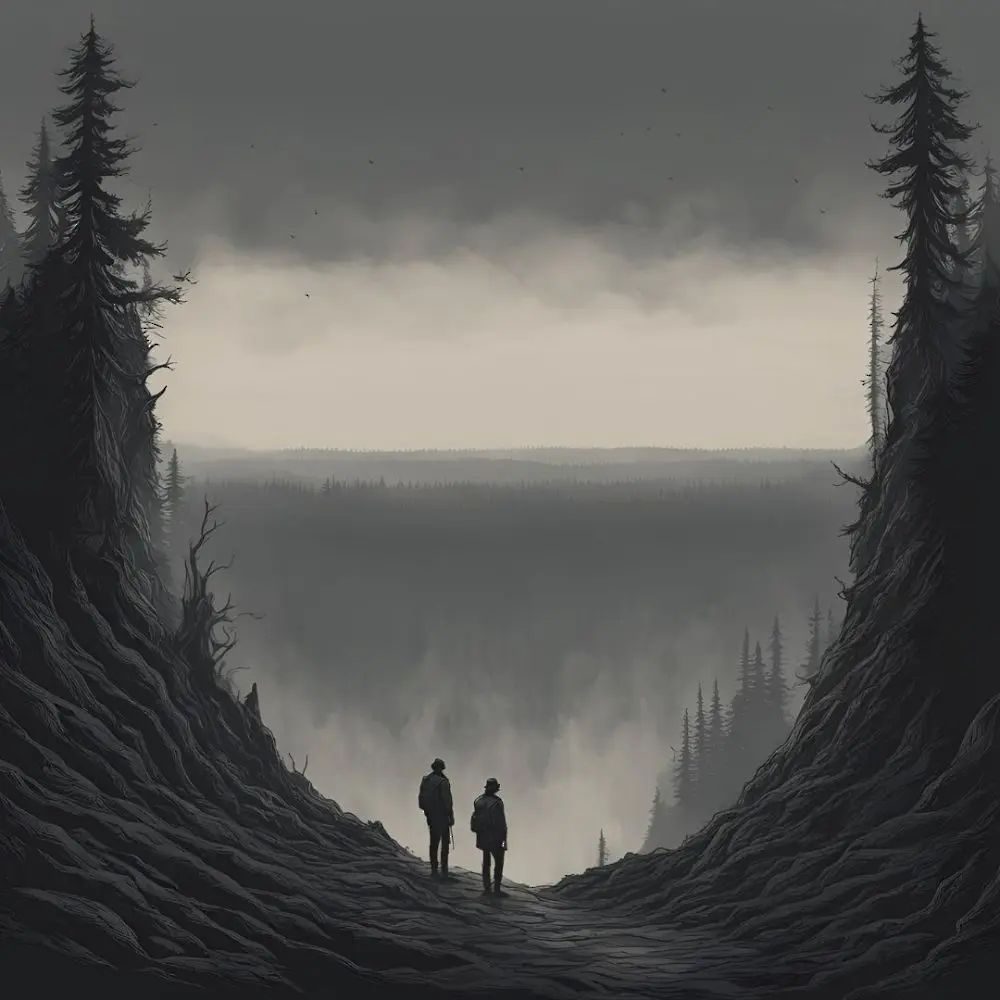 มองไป่าาคามืดัอึมครึมที่าุฝาาเทะ่ำาได้ทุกเื่ เบื้องหน้าพวกเาใเาี้คือุเที่กว้างใหญ่น่าเหลือเชื่อ ไกลลิบไปเห็นึป่าดงดิบที่ตั้งู่ ณ อีกฟาฝั่ง เื่มองไปยังุเที่ตัดผ่านุิ่กลายเป็หลุมายักษ์ ิ่ที่เห็นคือม่านหนาึ แะไ่าามองเห็น้ึ้เหวแ่นี้ได้เลยแม้แ่นิด